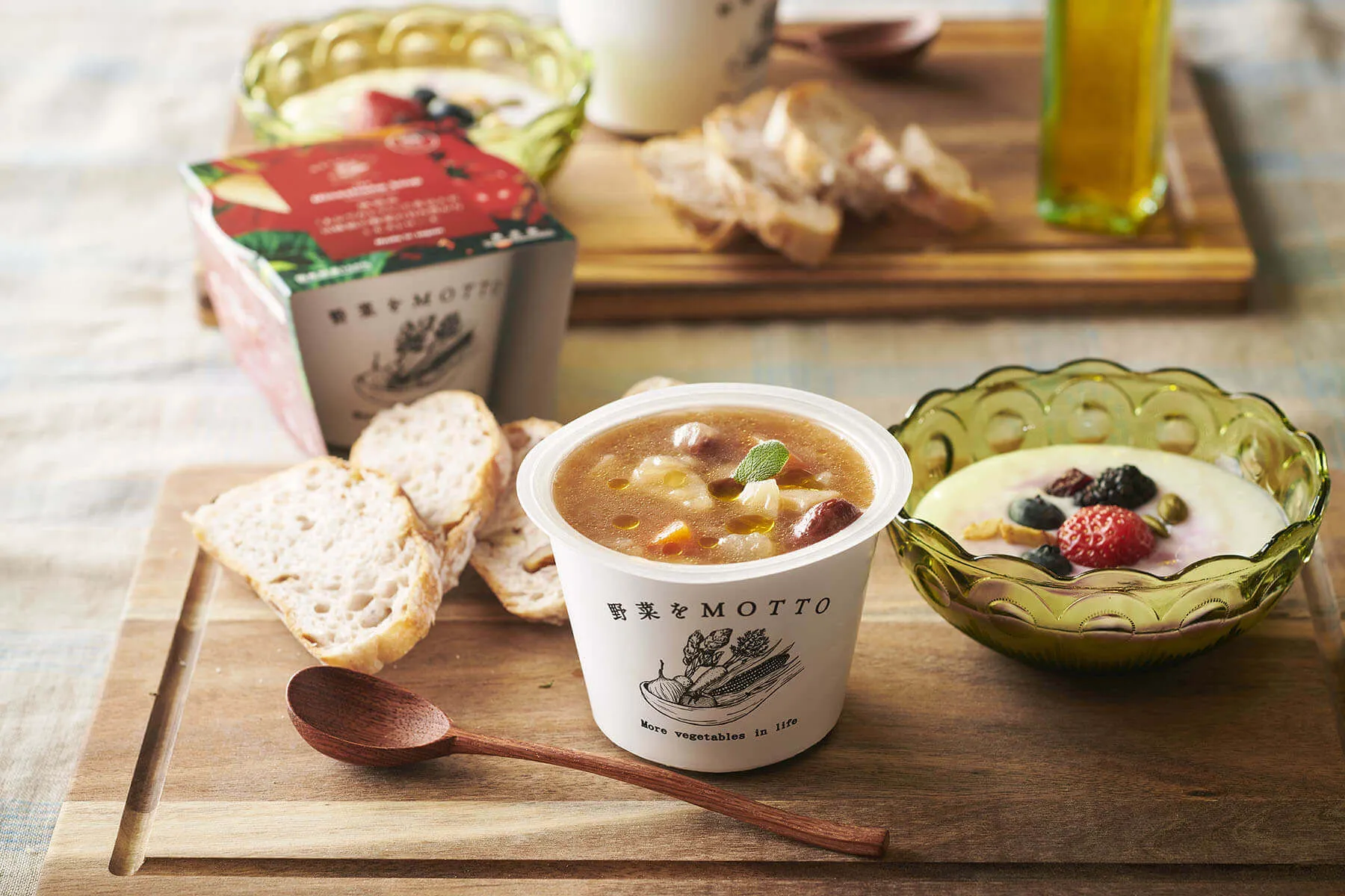 国産野菜を使って栄養たっぷり。保存料、うま味調味料、着色料不使用不使用のスープをカップに入れました。あとはレンジで1分、温めるだけ。ライフスタイルを変えてくれるあなたの毎日をもっと身軽にしてくれるそんなスープです。