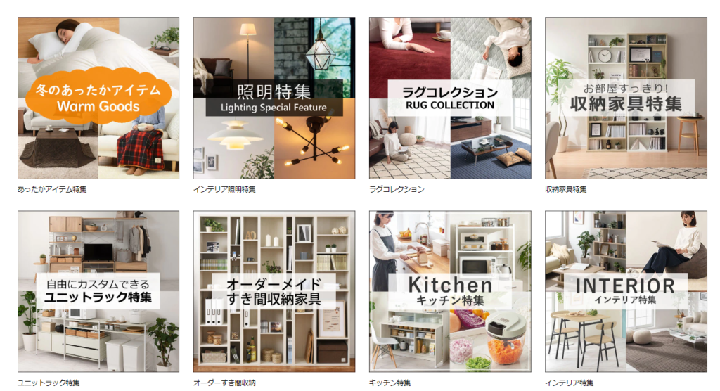 ・季節商品、家具やインテリアなどの特集を見ることができる!